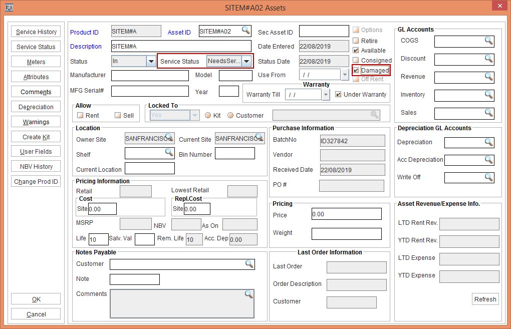 Search and Edit the Asset [SITEM#A02] and modify the Service Status drop-down to NeedsService and select the Damaged check box, as shown in Figure 2.0.