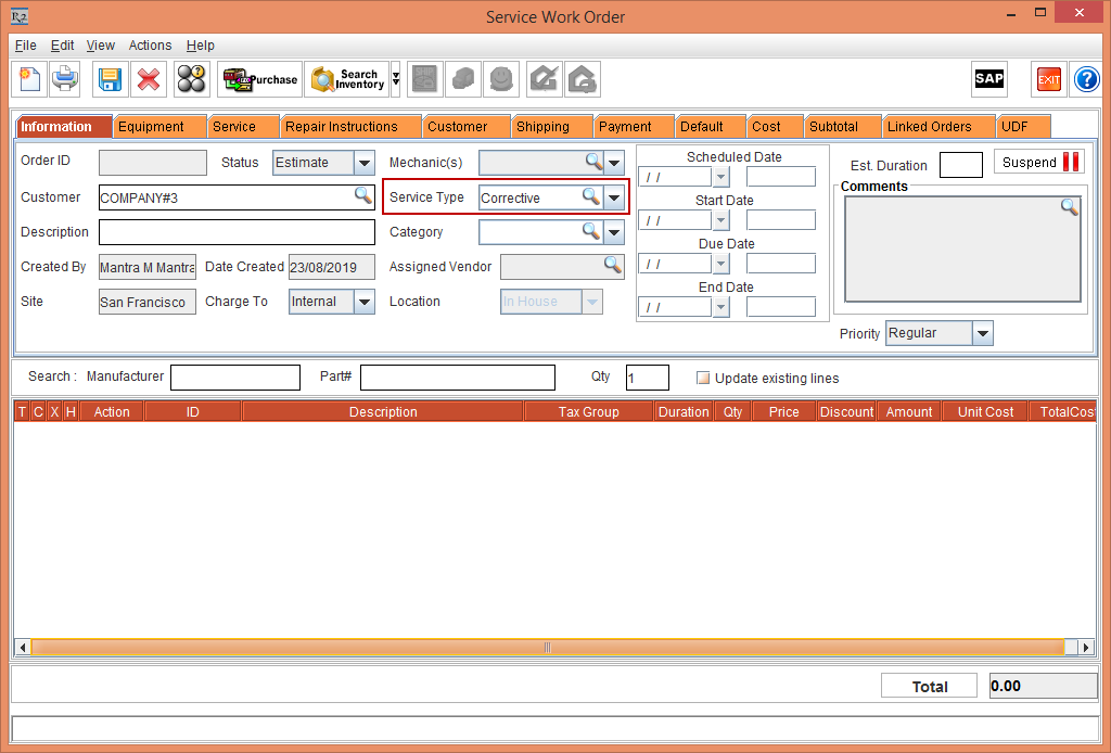 Select the Information tab. The Service Type is automatically selected and displayed as Corrective.