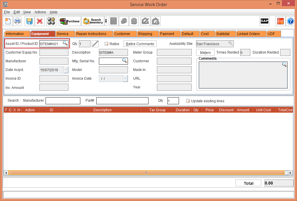 Select the Equipment tab and click the Asset ID / Product ID importable button. The Serial Assets / Non Serial Items window is displayed.