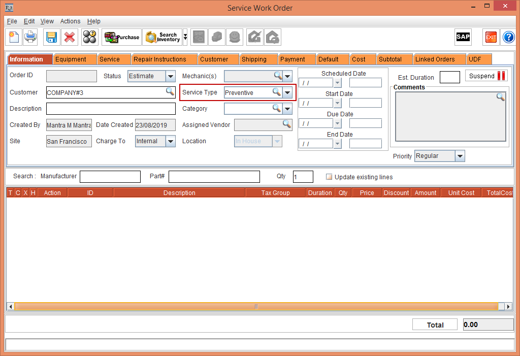 Select the Information tab. The Service Type is automatically selected and displayed as Preventive.