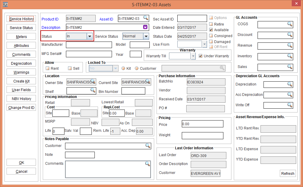 Click the Save button and the Close button. The Asset [S-ITEM#2-03] Status is modified to In.