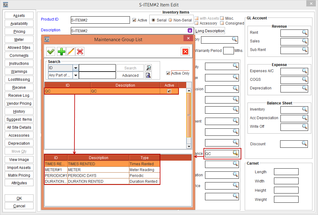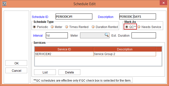 Note: Select the QC radio button from the Mark As section for each of the Schedules [PERIODIC] [DURATION] [TIMES RENTED], and [METER].