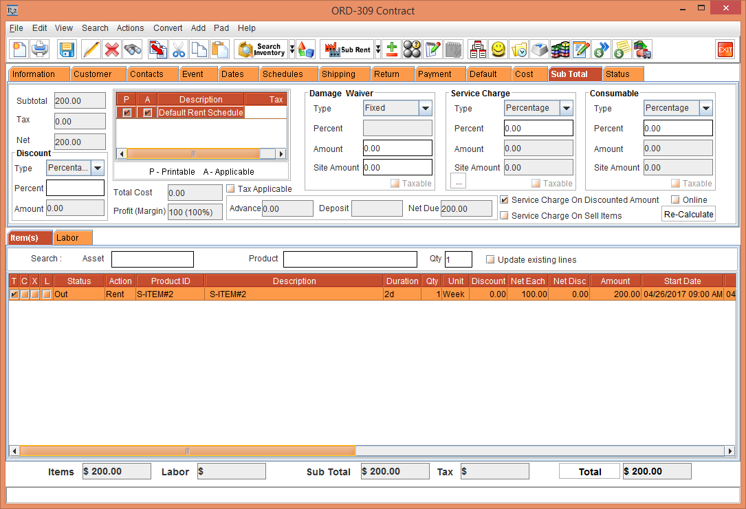 Create a Rental Reservation Order [ORDER-309] with duration as 2 days.