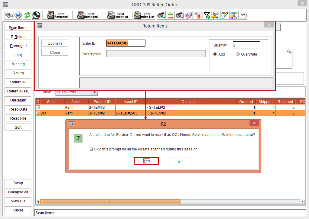 Select the Serial Item [S-ITEM#2] with the Asset [S-ITEM#2-03] and click the Scan Items button. The Return Items dialog box is displayed, as shown in Figure 3.1.