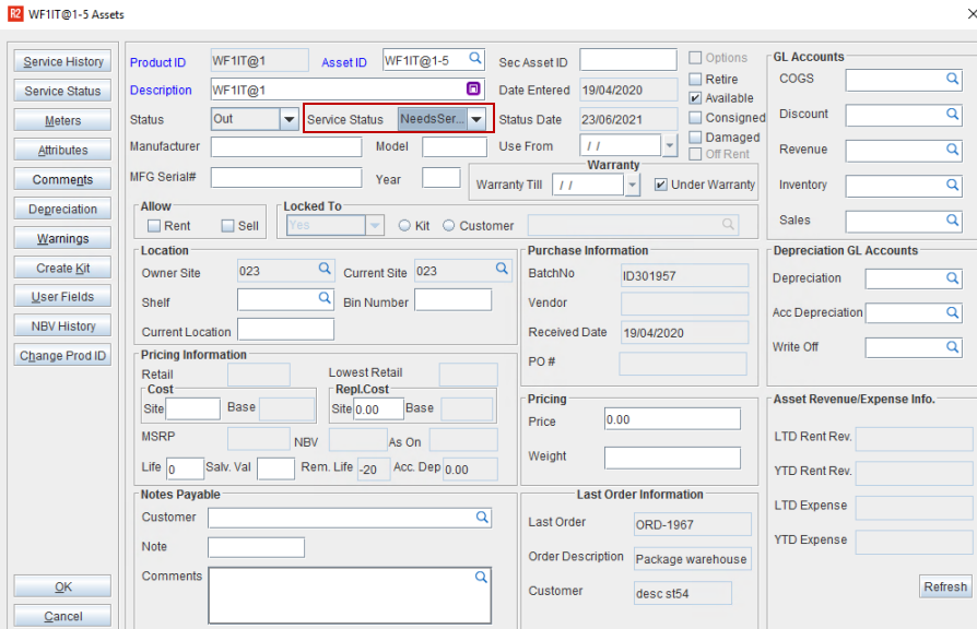 On clicking the Generate Needs Service icon, you can flag the Assets as Needs Service The Assets will be flagged as Needs Service only if it is scheduled for maintenance and if it satisfies the conditions defined in the Maintenance Group > Schedules definition that is tagged to the item in the Item edit window.
