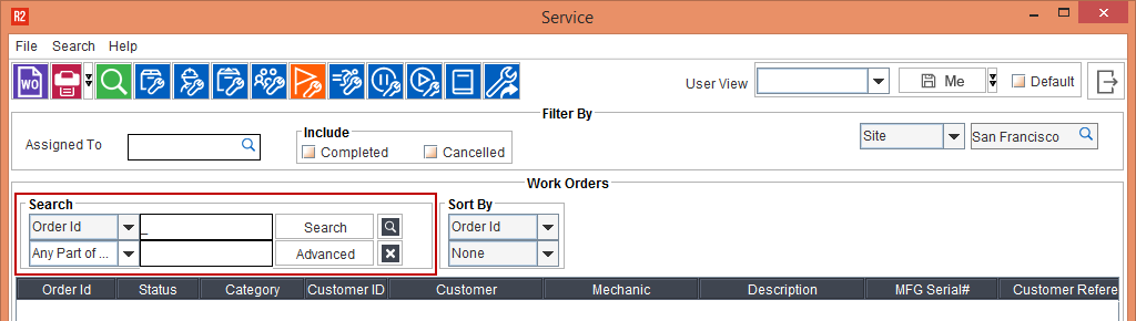 In the Service module, use the Search option to find the relevant Work Order, using an Order ID.