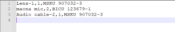 In the below figure, the first column is Product ID/Asset ID, second is quantity, and the last is the Container ID.