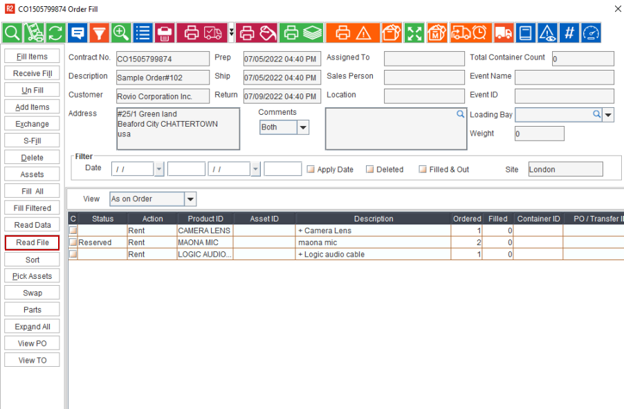Instead of opening each and every Order to read the file to fill the Items, 'Read File' option in 'Batch Fill' window helps in filling the items without opening the order and you can perform for multiple orders one after the other. Below is a glimpse of the same.