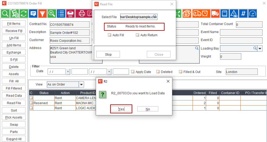 Read File feature reads the data from the CSV file and marks the asset and product as Filled and updates the respective container ID against the asset/product.