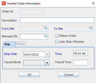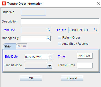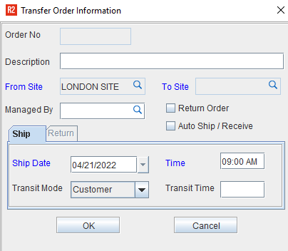 On initiating a new Transfer Order, R2 displays the Transfer Order Information dialog as per the type of Transfer Order.